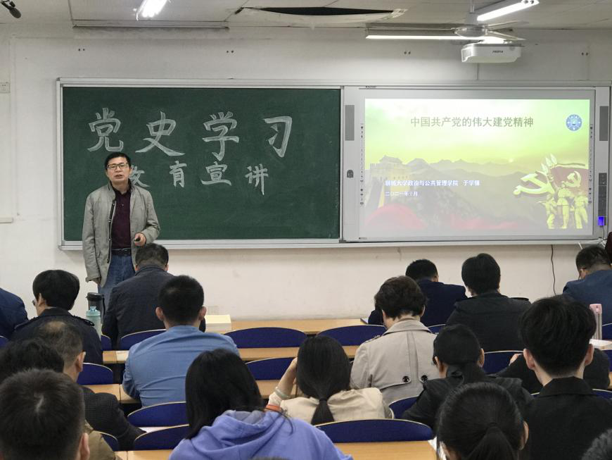 为了深入学习和贯彻习近平总书记“七一”重要讲话精神,持续推进党史学习教育入心、入脑。10月14日,女同 邀请党史学习教育宣讲团成员、 女同 政治与公共管理学院副院长于学强教授,在学院会议室举行了专题报告会,女同 党总支书记朱明英主持会议,全体教职工、学生党员参加。