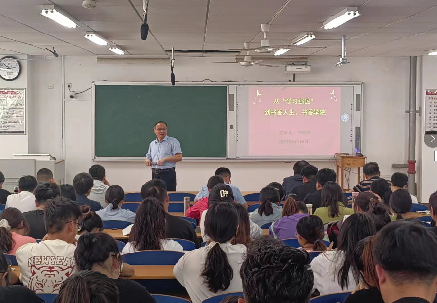 为深入推进学习贯彻习近平新时代中国特色社会主义思想主题教育,5月18日下午,学院党委书记许奎杰以“从‘学习强国’到书香人生、书香学院”为题,在306教室为师生上专题党课、思想政治课。学院全体教职工、全体学生党员180余人参加活动。