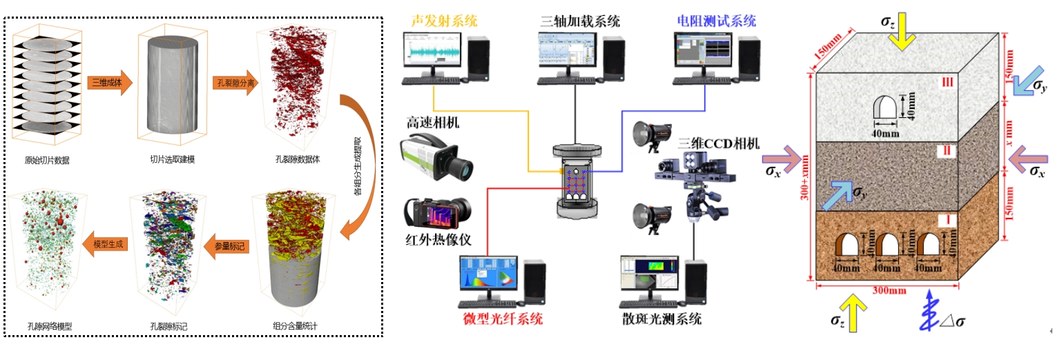 提出了岩石裂纹捕捉提取与动态传播反演新方法,阐释了岩石劣化损伤非线性累积与宏微观破坏内在联系。建立了采场覆岩结构力链演化模型,沿采空区走向和倾向,顶底板均呈现拱形力链,在三维空间中力链集结成束,上覆岩体荷载通过中强力链传递到工作面前、后方和侧翼未采煤层边缘形成力链集中,揭示了采场围岩形成支承压力力学本质。自主研发的流变伺服试验机静载-扰动加载模块开展静应力与循环扰动耦合测试系统,探讨不同组合类型围岩结构体各应力分区的偏应力分布特征,解释围岩结构体对不同静载水平、扰动幅值及扰动周期力学响应特征,构建围岩结构体应力释放时空演化模型。