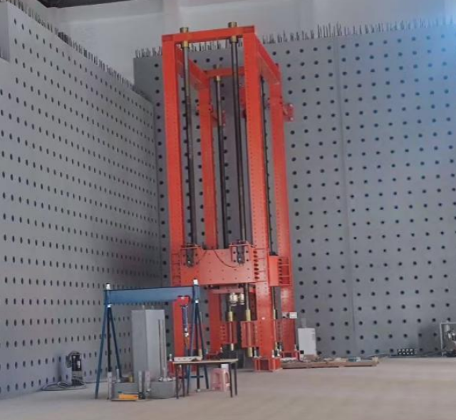 设备整体由主梁、反力柱、台座拉杆及螺母、水平滑板及油缸连接板、主梁端部连梁、横梁升降系统、框架顶部连梁、竖向作动器及加载球铰、分油子站、电液伺服控制系统以及实验辅助配件等组成。