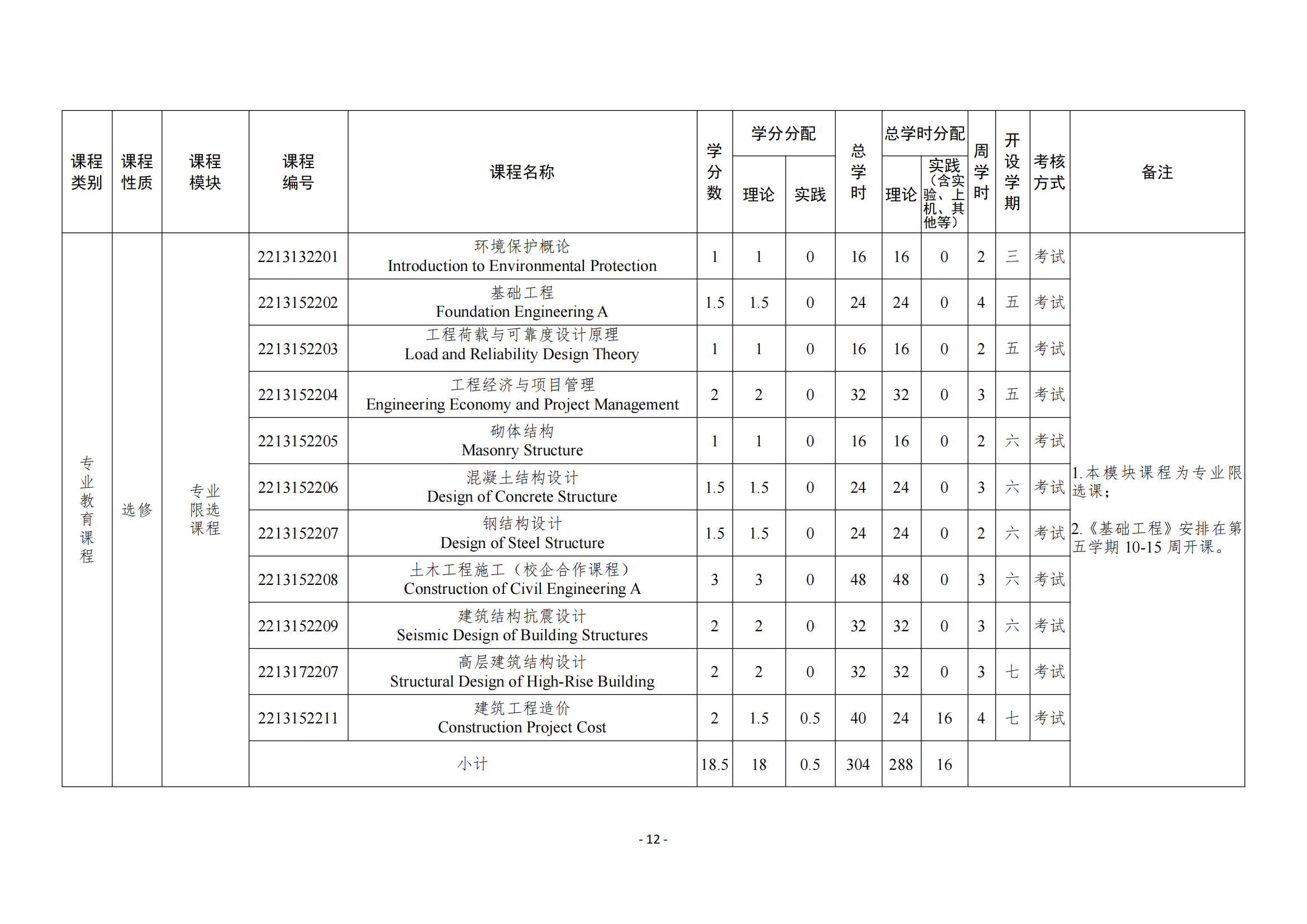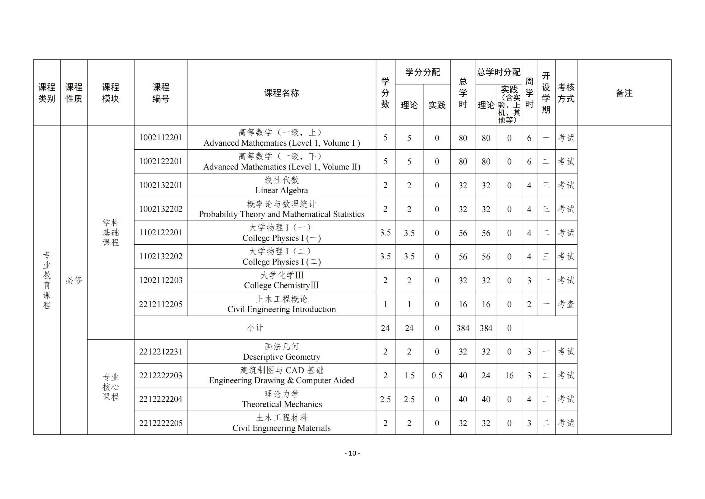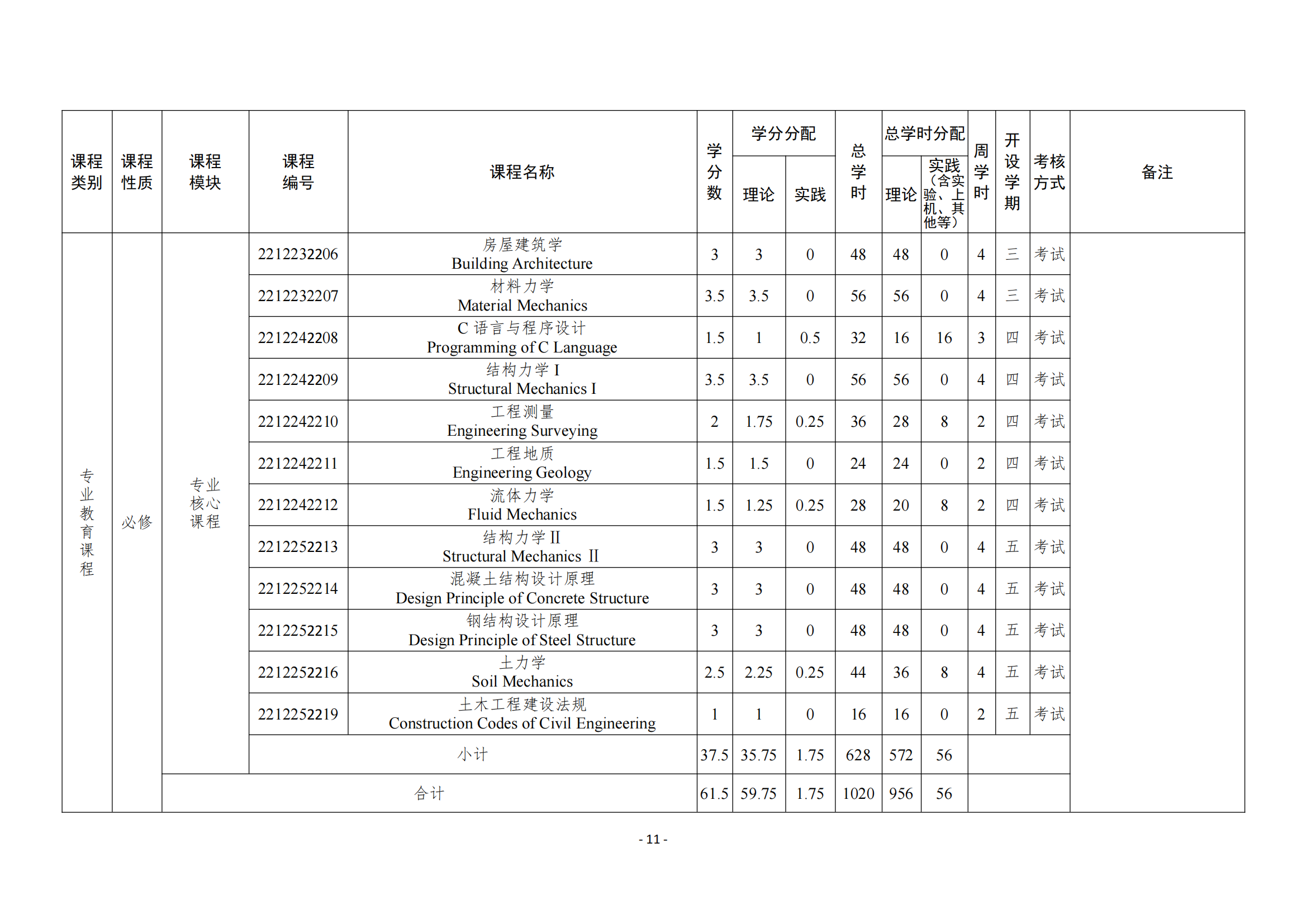 主要课程:高等数学、线性代数、概率论与数理统计、土木工程概论、画法几何、建筑制图与 CAD 基础、房屋建筑学、理论力学、材料力学、结构力学、土力学、基础工程、工程测量、土木工程材料、混凝土结构设计原理、钢结构设计原理、建筑结构抗震设计、土木工程施工等。