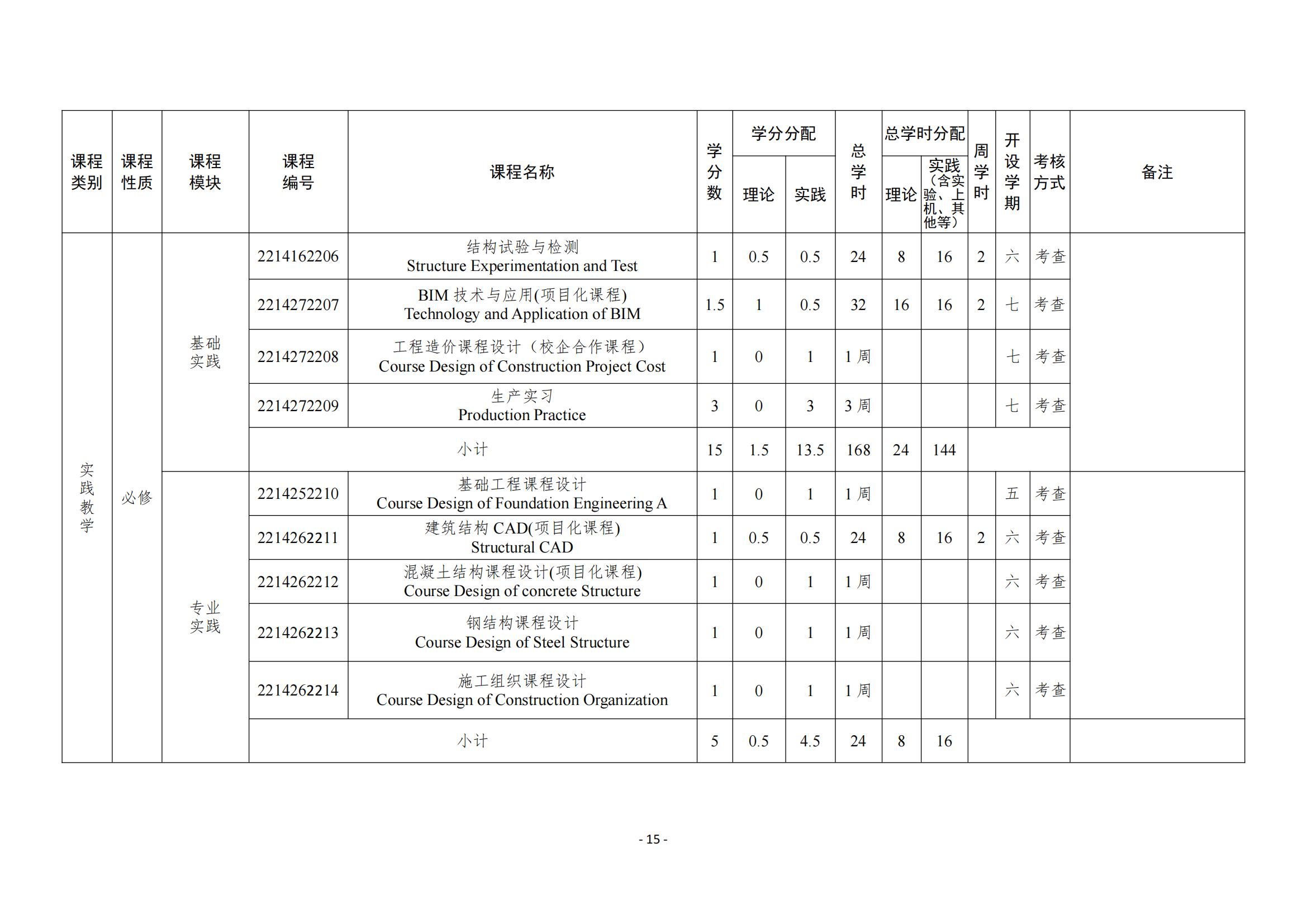 大学物理实验、大学化学实验、工程材料与材料力学实验、结构试验与检测、房屋建筑学课程设计、基础工程课程设计、混凝土结构课程设计、钢结构课程设计、施工组织课程设计、单层工业厂房设计、工程造价课程设计、认识实习、测量实习、工程地质实习、建筑结构 CAD、生产实习、毕业实习、毕业设计等。
