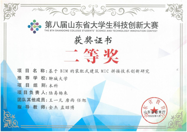 学生陆易杨来在“第八届山东省大学生科技创新大赛”荣获二等奖