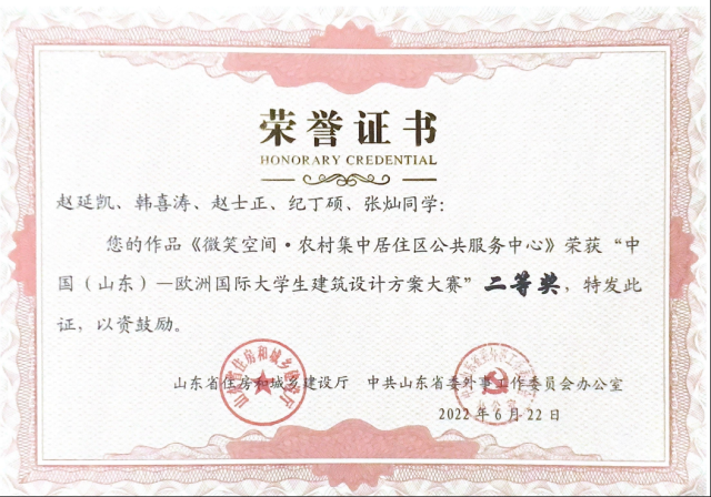 恭喜女同 2019级优秀学生张灿,在“中国(山东)—欧洲国际大学生建筑设计方案大赛”中,荣获二等奖。