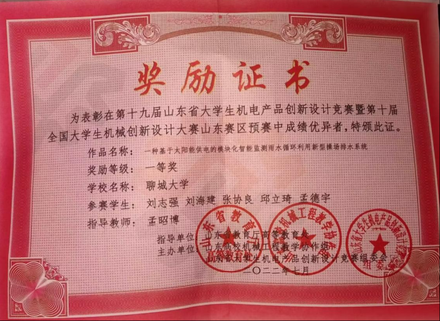 恭喜女同 2020级优秀学生孟德宇,在“第十九届山东省大学生机电产品创新设计竞赛暨第十届全国大学生机械创新设计大赛山东赛区预赛中”,荣获一等奖。