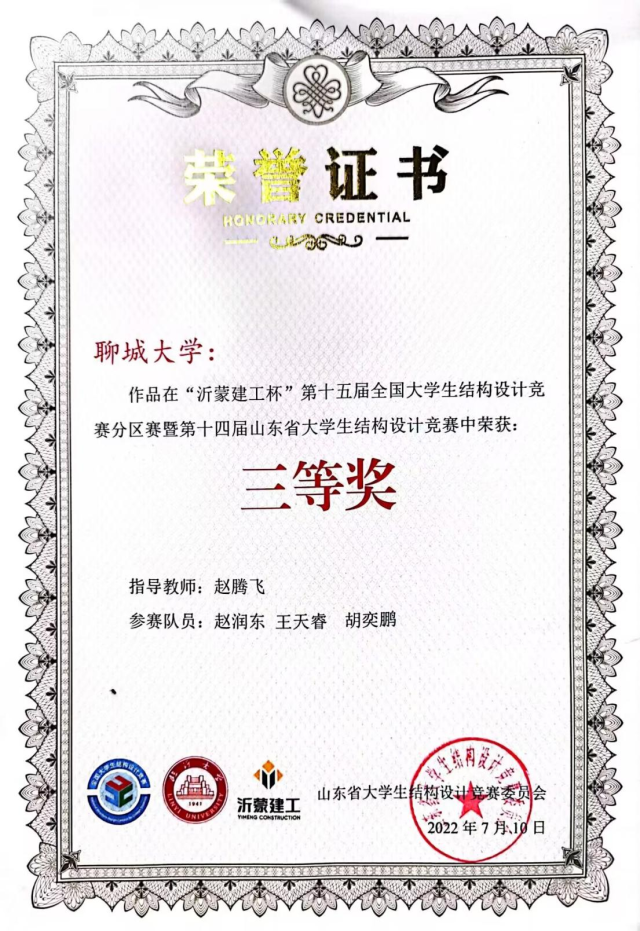 恭喜女同 2020级优秀学生赵润东、王天睿,在“沂蒙建工杯”第十五届全国大学生结构设计竞赛分区赛暨第十四届山东省大学生结构设计竞赛中,荣获三等奖。