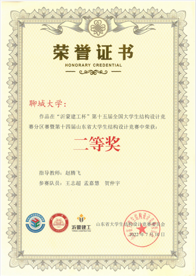 恭喜女同 2020级优秀学生王志超,在“沂蒙建工杯”第十五届全国大学生结构设计竞赛分区赛暨第十四届山东省大学生结构设计竞赛中,荣获二等奖。