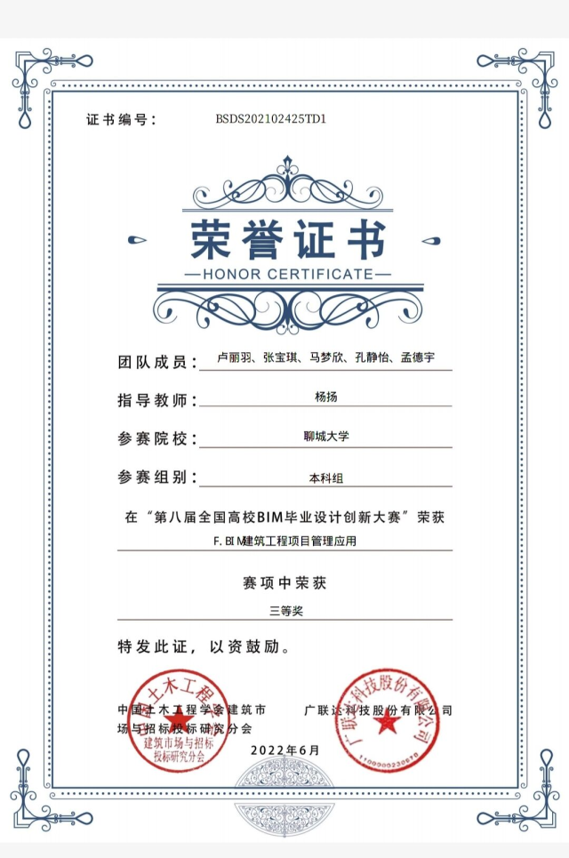 恭喜女同 2020级优秀学生卢丽羽,在“第八届全国高校bim毕业设计创新大赛”F模块BIM建筑工程项目管理应用中,荣获三等奖。