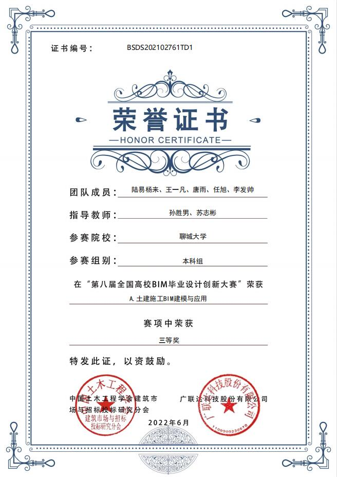 恭喜女同 2019级优秀学生陆易杨来,在“第八届全国高校bim毕业设计创新大赛”A模块土建施工BIM建模与应用中,荣获三等奖。