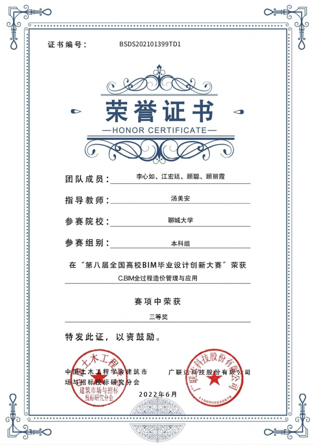 恭喜女同 2020级优秀学生顾丽霞,在“第八届全国高校bim毕业设计创新大赛”C模块BIM全过程造价管理与应用中,荣获三等奖。