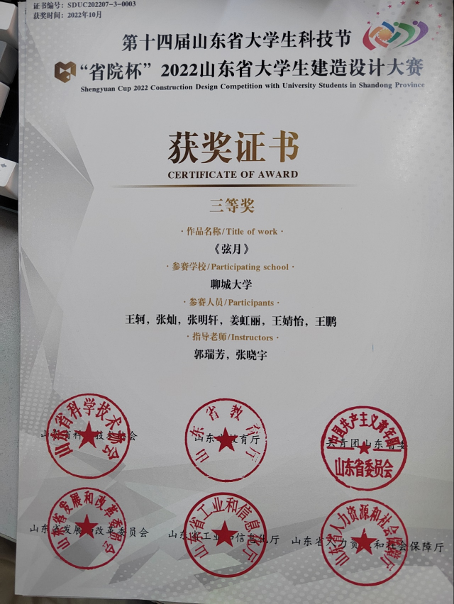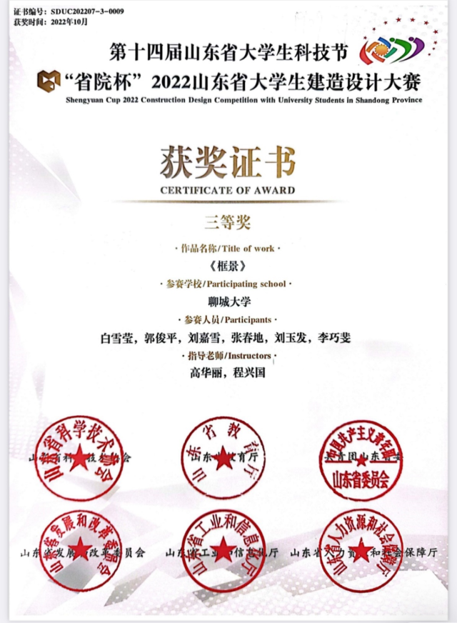恭喜女同 2020级优秀学生姜虹丽、王婧怡,在第十四届山东省大学生科技节“省院杯”2022山东省大学生建造设计大赛中,荣获三等奖。