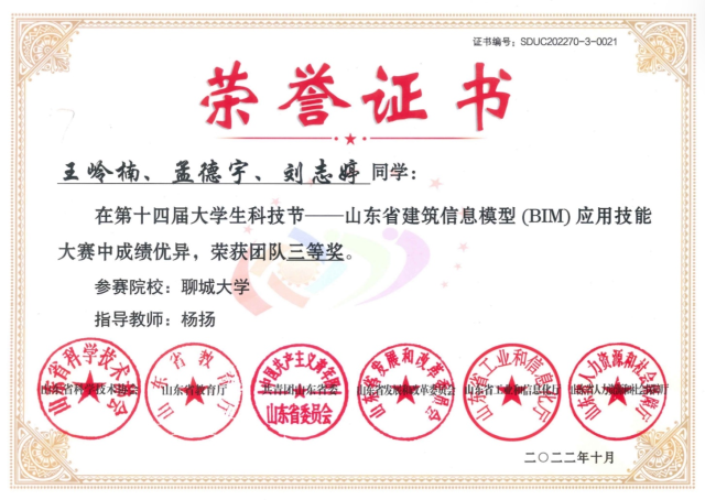 恭喜女同 2020级优秀学生王岭楠、孟德宇,在“第十四届大学生科技节——山东省建筑信息模型(BIM)应用技能大赛”中,荣获团体三等奖。