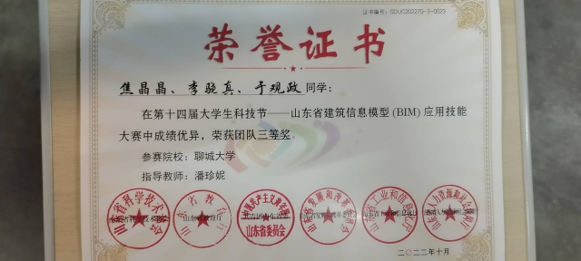 学生在“第十四届大学生科技节——山东省建筑信息模型(BIM)应用技能大赛”中获奖