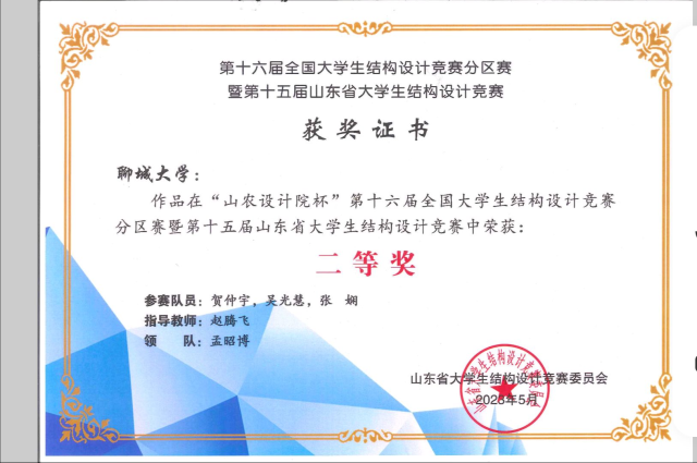 恭喜女同 2021级优秀学生张娴、吴光慧,在“第十六届全国大学生结构设计竞赛分区赛暨第十五届山东省大学生结构设计竞赛”中,荣获二等奖。