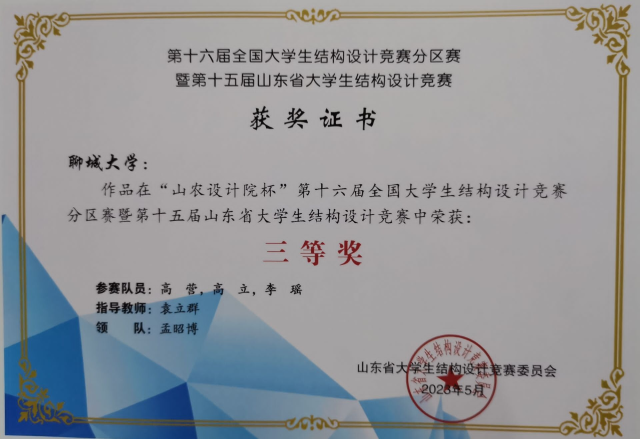 恭喜女同 2021级优秀学生高立、高营,在“第十六届全国大学生结构设计竞赛分区赛暨第十五届山东省大学生结构设计竞赛”中,荣获三等奖。