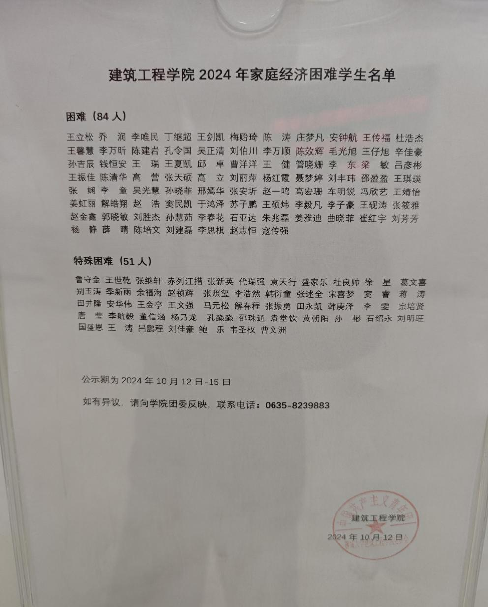 2024年家庭经济困难认定经本人申请、班级评议和公示、学院家庭经济困难学生认定小组综合评定,现将2024年家庭经济困难学生拟推荐结果予以公示,公示3个工作日,自2024年10月12日—2024年10月15日,如有异议请于公示期内反映,电话0635-8239883,接受来访地点:女同 五号教学楼A区201。