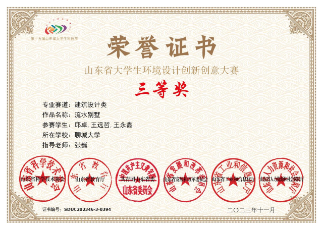 恭喜女同 2021级优秀学生邱卓,在山东省大学生环境设计创新创意大赛中,荣获三等奖。