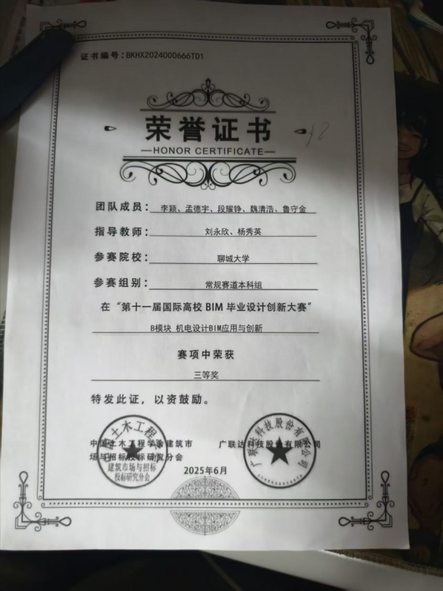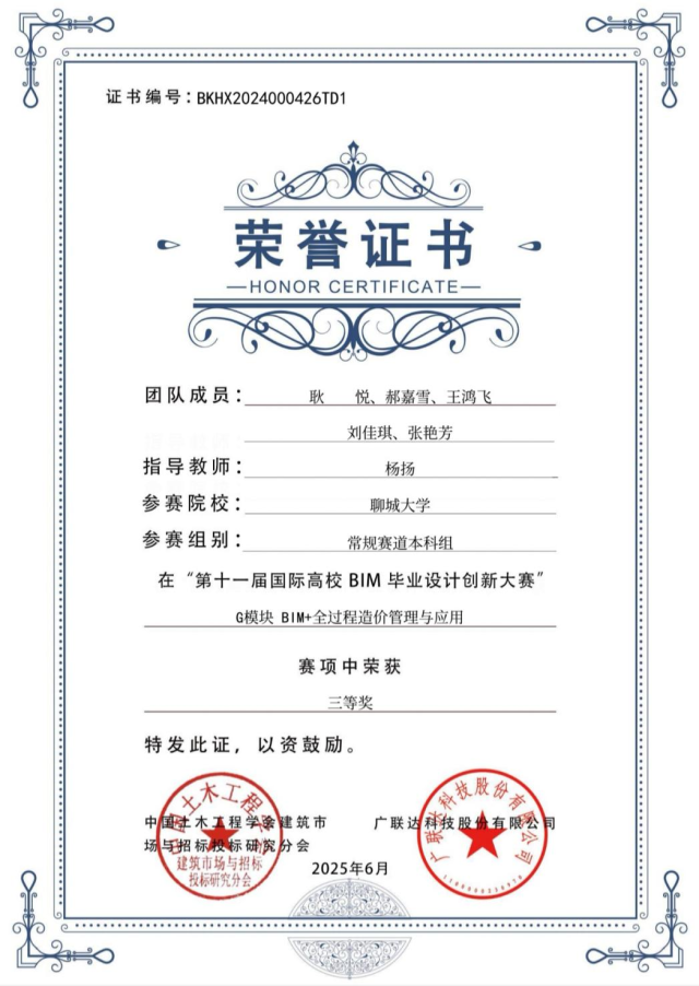 恭喜女同 2024级优秀学生刘芳芳在第十一届“国际高校BIM毕业设计创新大赛”中,荣获团队二等奖,2023级优秀学生张艳芳、2023级优秀学生鲁守金荣获团队三等奖。