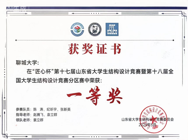 恭喜女同 2023级优秀学生陈涛、2023级优秀学生张新英,在第十七届“山东省大学生结构设计竞赛暨第十八届全国大学生结构设计竞赛分区”中,荣获团队一等奖。