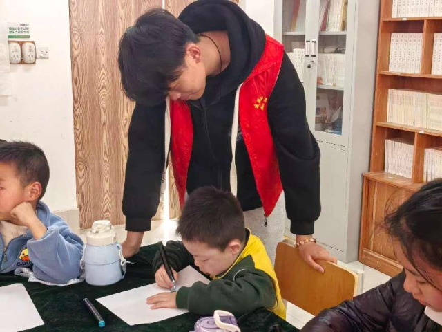 同学们精心设计的“画笔传情”绘画环节,成为打开孩子们心灵世界的桥梁。在五彩斑斓的画纸前,孩子们用七彩画笔勾勒对世界的想象。同学们耐心陪伴,通过“你画我猜”的互动方式,从线条色彩中解读童真世界,让艺术成为情感交流的无声语言。随后开展的“光影筑梦”投影仪游戏环节点燃全场热情。同学们将思维训练与想象力培养融入几何图形创意拼接、光影故事接龙等趣味内容,引导孩子们在动态光影中突破思维定式,同学们用真诚和耐心营造了轻松愉快的氛围,让每个孩子都能畅所欲言,感受到满满的关爱与认可。