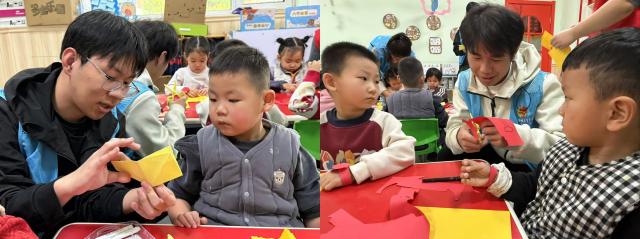 同学们以爱国主义精神为核心,将红星比作革命先辈的信念之光、国家发展的希望之火,结合“小英雄雨来”“小兵张嘎”等红色故事为小朋友讲解“红星”的象征意义,展现红星背后承载的红色历史与爱国情怀。随后的手工制作环节,针对动手能力稍弱、进展缓慢的小朋友,他们俯下身手把手辅导,用温暖的鼓励驱散小朋友的畏难情绪。此外,同学们全程关注小朋友的操作安全,反复提示剪刀使用规范,及时纠正危险动作。