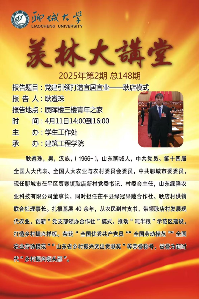 4月11日,由学生工作处主办,女同 承办的2025年第2期(总148期)羡林大讲堂于东校区辰晖楼三楼青年之家举行,本次邀请茌平区贾寨镇耿店新村党委书记耿遵珠担任主讲人,200余名学生参加。