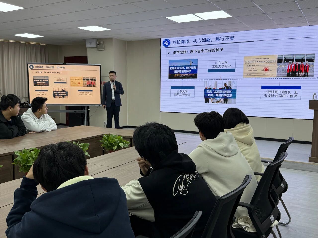 李辉以 “科技报国,青春筑梦” 为题,从“成长溯源、科研锚点、创新实践、同心致远、青春寄语”五个方面展开分享。在成长溯源方面,他结合自身经历讲述科研工作经历与投身地下探查领域的契机;他在科研锚点方面指出,我国是世界上地下工程建设规模和难度最大的国家,要深度发掘国家在地下探查领域的需求;在创新实践方面,他表示要将技术先进性与经济社会效益相结合,实现多项理论、技术创新,并将其应用于实际工程之中;他强调要做到同心致远,对团队协作有足够的重视,利用好资源共享、集体智慧等优势解决更多更难的问题;他在讲解青春寄语时,鼓励同学们将专业所学与国家需求相结合,在岩土工程及相关领域主动作为,以科技为翼,以青春为帆,在报国路上书写精彩人生。