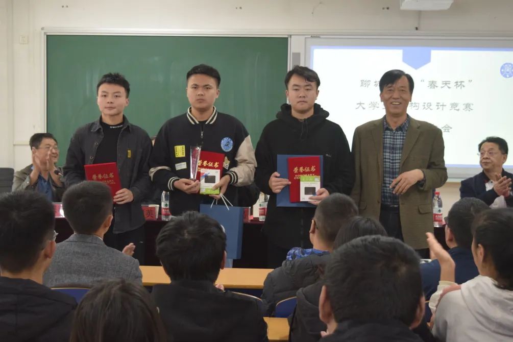 李志民总经理宣读获奖名单。 赵腾飞、袁立群获优秀指导教师,王一凡 张祥航 周升磊获校赛一等奖,荆广杰 石振先 李文娜等9名同学获得校赛二等奖,任旭 张孝天 陆易杨来等12名同学获得校赛三等奖。刘秀棋 雷浩 张祥航获得山东省第十三届大学生结构设计大赛最佳创意奖和二等奖。