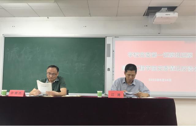 根据学校党委统一部署,6月24日下午,学校党委巡察建筑工程学院党委情况反馈会在5A206召开。学校党委第一巡察组组长江涛宣读了巡察反馈意见,学院党委书记许奎杰主持反馈会议,并就做好巡察整改工作进行表态发言。