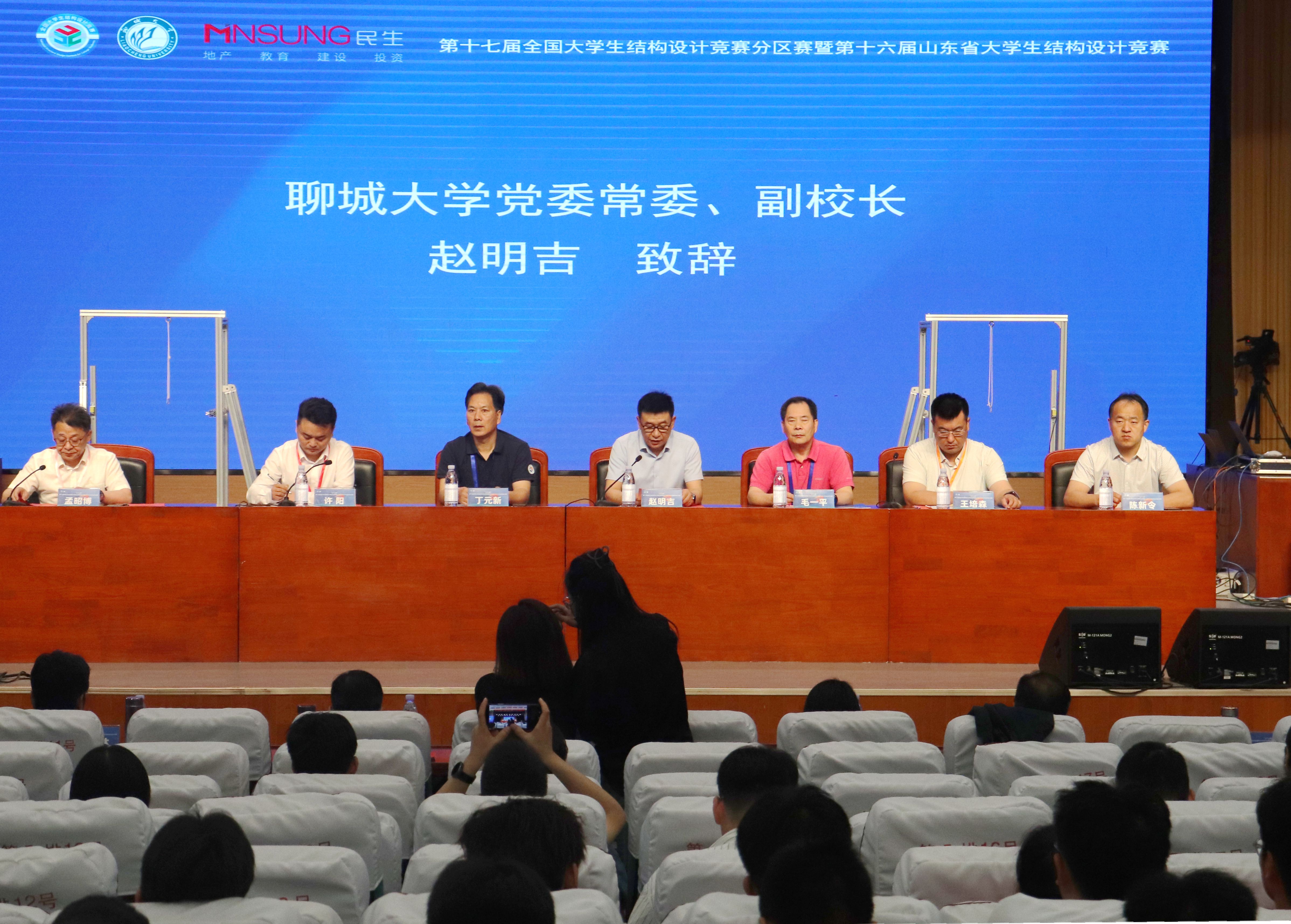 全国大学生结构设计竞赛委员会副秘书长毛一平、丁元新,山东省大学生结构设计竞赛委员会秘书长王培森,女同 党委常委、副校长赵明吉, 女同 土木工程专业2009级校友、民生阳光集团董事、山东民兴建筑工程有限公司总经理许阳出席开幕式。学校相关职能部门负责人、有关专业师生代表和来自山东大学、中国石油大学(华东)、哈尔滨工业大学(威海)等省内30所高校的61支参赛队伍共计300余人参加活动。开(闭)幕式由女同 院长孟昭博主持。
