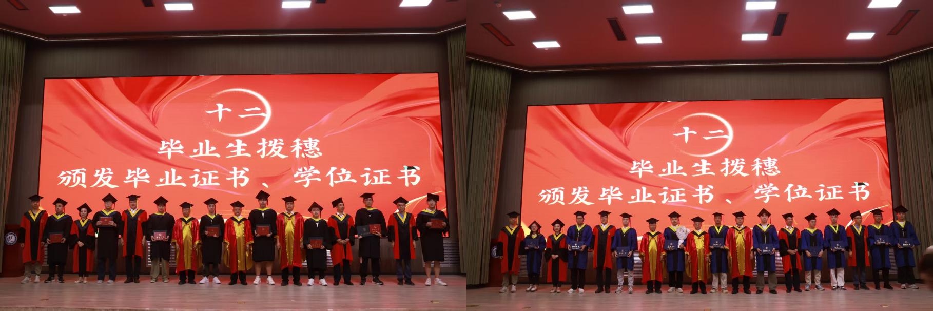 学位授予环节,学院领导与教师代表为毕业生拨穗并颁发毕业证书、学位证书。流苏从右至左轻轻拨动,象征着毕业生们完成学业的蜕变,现场快门声不断,记录下这一荣耀而珍贵的瞬间。
