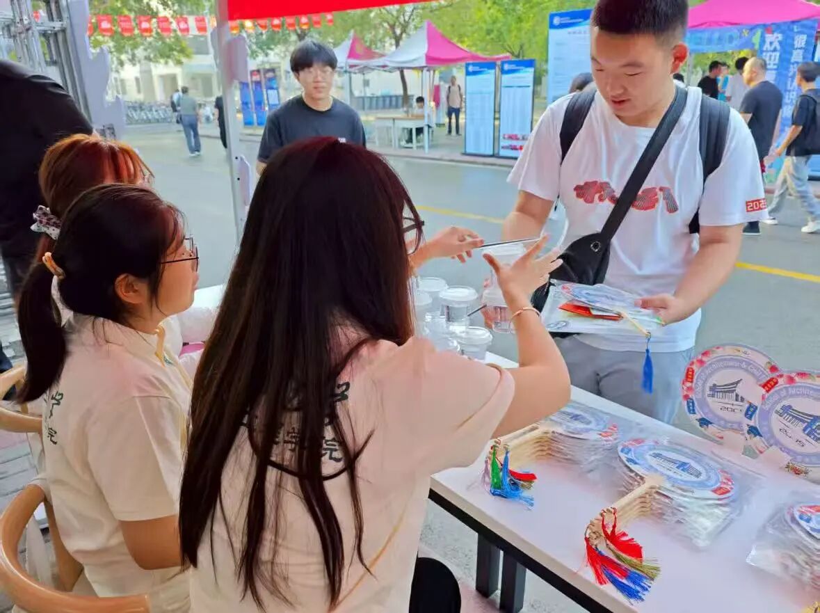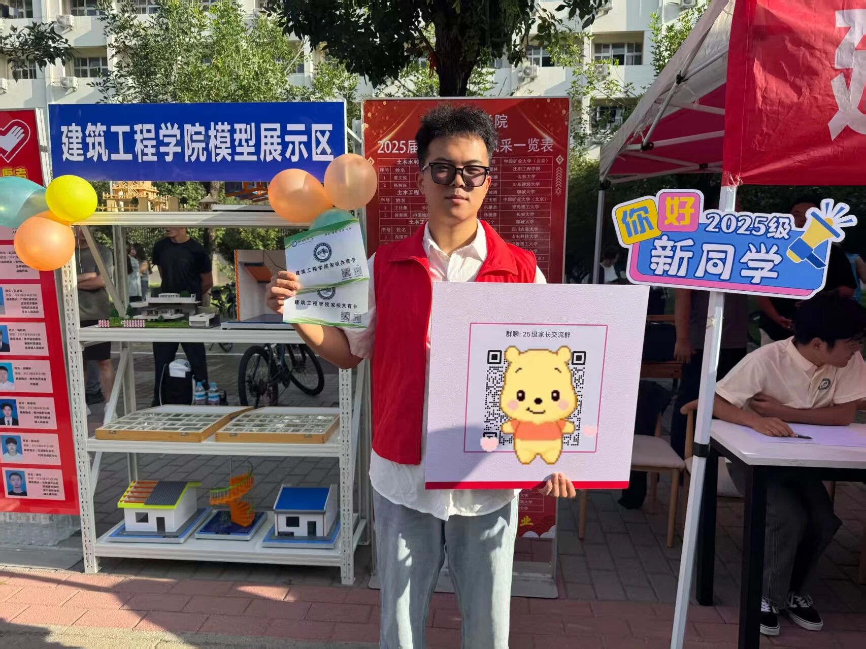 学院在东校设立了“新生接待点”,摆放了“热烈欢迎2025级新同学”的醒目展板,以及新生签字打卡拼图。在炎炎夏日,学院贴心准备了清凉解暑的绿豆汤和学院专属的文创扇子。在建筑模型展示区,陈列着学生设计的住宅、公共建筑等作品,让新生和家长感受到浓浓的归属感与亲切感。